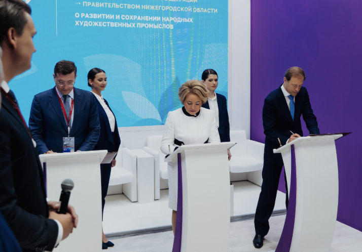 Председатель Совета Федерации Валентина Матвиенко, Министр промышленности и торговли Денис Мантуров и губернатор Нижегородской области Глеб Никитин подписали соглашение о сотрудничестве и проведении ряда мероприятий, посвященных народным промыслам.