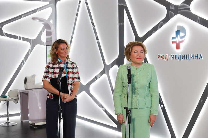 В рамках открытия кабинета медицины будущего также состоялся телемост Валентины Матвиенко и Елены Жидковой с сотрудниками сети «РЖД-Медицина».